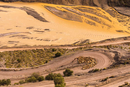 Sand quarry from a great height, beautiful orange patterns on the rocks
