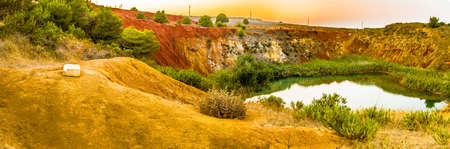 red soils around the freshwater lake formed in a former quarry for the extraction of bauxite in Italy