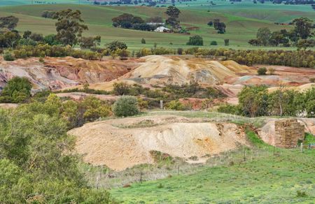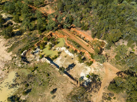 Drone aerial view looking down over sapphire mine diggings in central Queensland Australia.