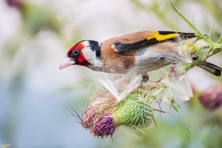 European goldfinch, feeding on the seeds of thistles. European goldfinch or simply goldfinch, latin name Carduelis carduelis, Perched on a Branch of thistle