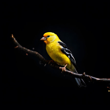 A bright yellow bird with black wings rests on a tree branch. The image features a shallow depth of field, with soft focus green foliage in the background. The lighting suggests a daytime setting, suitable for illustrating nature, wildlife, or environmental themes. This image could be used for various commercial or editorial purposes.
