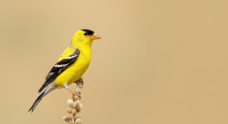 American goldfinch perched on plant with subtle beige background for nature and wildlife enthusiasts