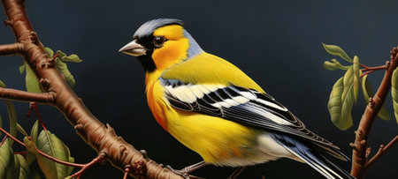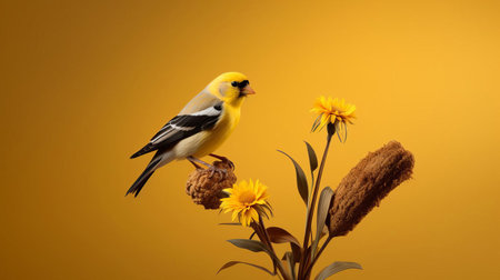 a close-up photo of a yellow goldfinch, captured in the contemporary portrait photography style of the dusseldorf school. the image showcases bold chromaticity with hints of light orange and light navy. this studio portraiture piece draws inspiration from the northern renaissance and is a testament to the photographer's expertise in object portraiture. ai generated