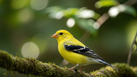 A bright yellow bird with black and white accents is perched on a mossy branch. The image exhibits a shallow depth of field, showcasing the bird against a soft, blurred background of green leaves and highlights. This naturalistic scene is likely suitable for nature, wildlife, or environmental-themed projects.