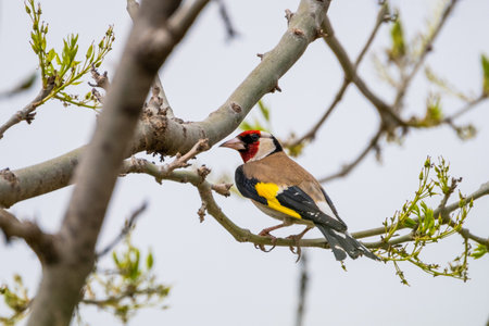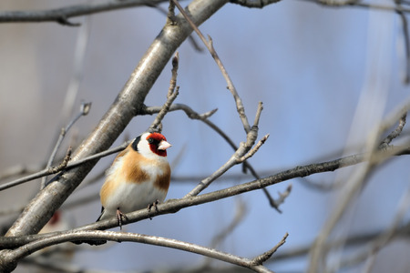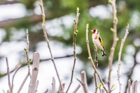 Perching Goldfinch (Carduelis carduelis) in early spring. Moscow region, Russia