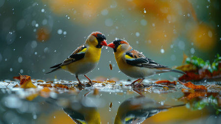 European goldfinch among the fallen leaves in the water,autumn colored bird, unique moment,