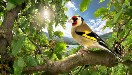 A goldfinch (Carduelis carduelis) bird in the sunlight on a green tree branch.