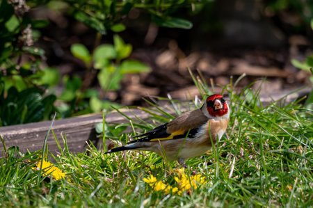 Goldfinche, Carduelis carduelis, collecting dandelion petals for nest building