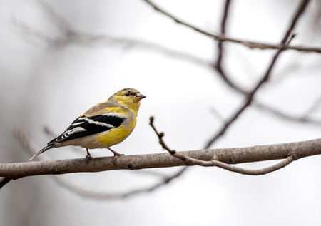 Close up of an American Goldfinch (Spinus tristis) perched on a branch during winter in Wisconsin. Selective focus, background blur and foreground blur.