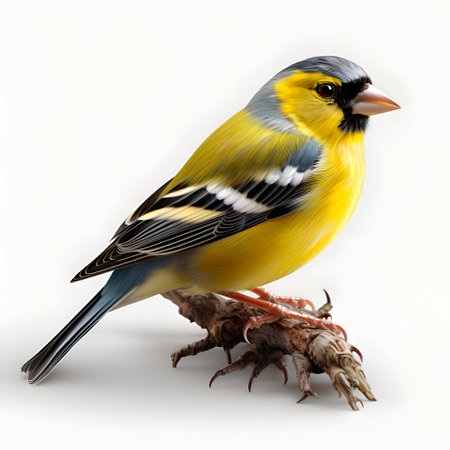 3D render of a goldfinch on a white background.