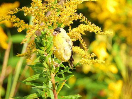 Bird on Wildflower: An American goldfinch bird perched on the stem of a goldenrod wildflower in the early morning sunrise at dawn eating breakfast