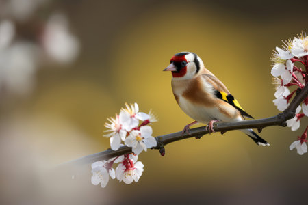 Goldfinch bird sitting on a branch of a blossoming tree