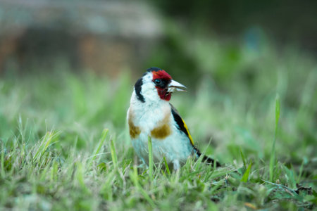 A Goldfinch Lugano standing on the grass, with an out-of-focus background