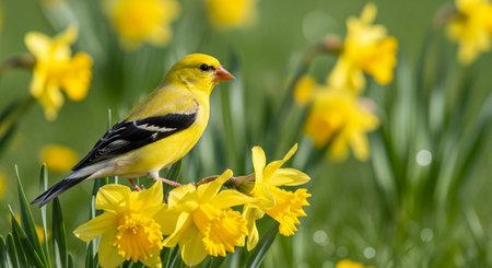 American goldfinch perched among vibrant yellow daffodils in spring