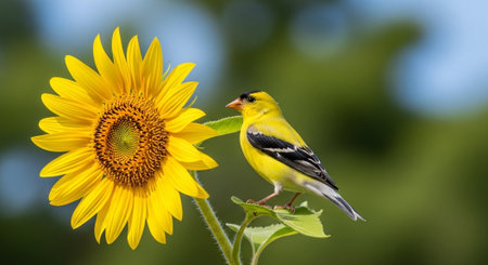American Goldfinch perched on vibrant sunflower in summer field