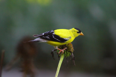 American Goldfinch perched on sunflower head with blurred background