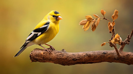 the american goldfinch showcases its vibrant yellow plumage and distinctive black cap in this stunning close-up portrait, expertly captured in a surreal fashion photography style that highlights the bird's intricate facial features and bright, inquisitive eyes amidst a soft, dreamy background. ai generated