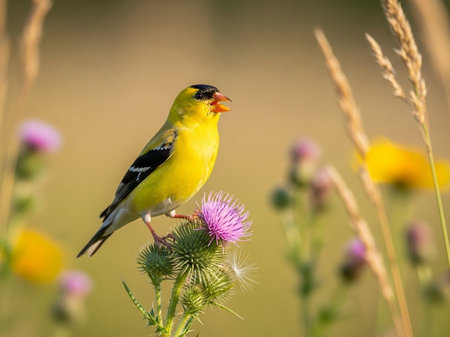 American Goldfinch (Spinus tristis) perched on a thistle