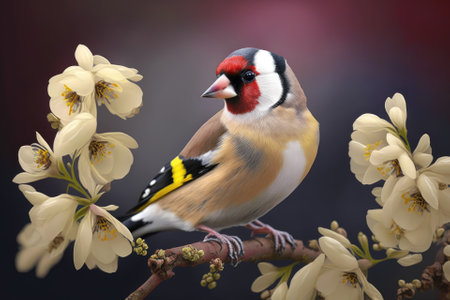 Carduelis carduelis, goldfinch, single bird on blossom. Generative AI