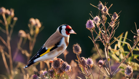 A dainty goldfinch rests on a wildflower stem, enveloped in golden light and soft bokeh, creating a serene atmosphere.