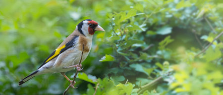 single goldfinch bird sitting on a branch of a bush and looks to the side