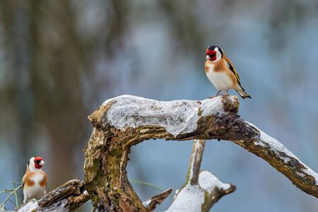 Two of european goldfinches (Carduelis carduelis) in winter. Cute colorful little songbirds. Birds in wildlife.