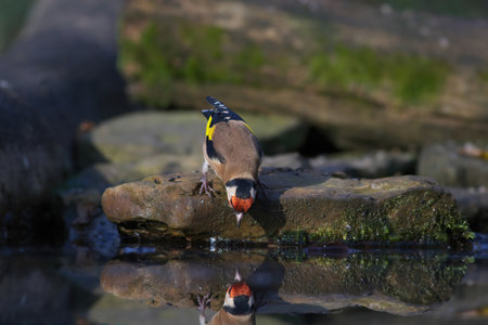 A closeup of a beautiful goldfinch drinking water from a lake in the forest