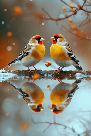 Two beautiful goldfinches with striking red faces and yellow markings are captured in a winter scene with gentle snowfall.