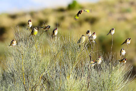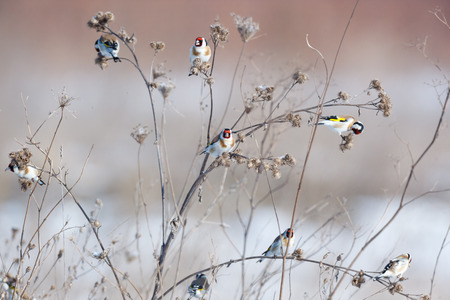 A group of European Goldfinches with distinctive red faces and yellow wing bars rest on dried plant stalks. The background is blurred, highlighting the birds.
