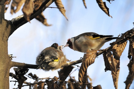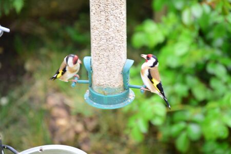 Three European goldfinch or simply the goldfinch (Carduelis carduelis). Small passerine bird in the finch family that is native to Europe.