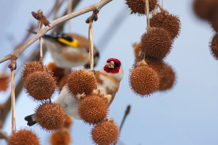 European goldfinch bird, Carduelis carduelis, perched, eating and feeding seeds during Winter season