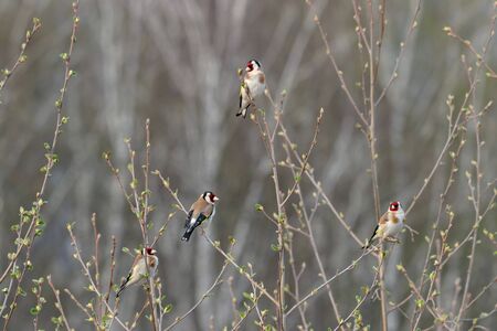 Group of european goldfinches carduelis carduelis eating buds on tree in early spring. Cute little colorful songbirds in wildlife