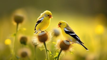 the american goldfinch showcases its vibrant yellow plumage and distinctive black cap in this stunning close-up portrait, expertly captured in a surreal fashion photography style that highlights the bird's intricate facial features and bright, inquisitive eyes amidst a soft, dreamy background. ai generated