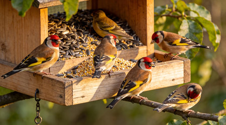 A close-up view of a cluster of European Goldfinches perched on a suet feeder, enjoying a meal during the colder months.