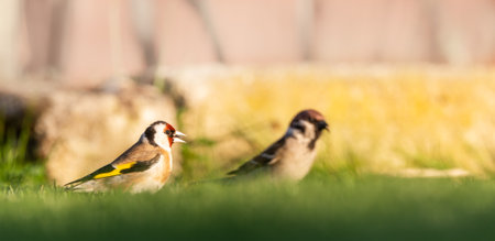 Horizontal photo of single male goldfinch. The bird has nice brown, white, red black and yellow color. Animal is perched on ground with male sparrow and looks for seeds in green grass.