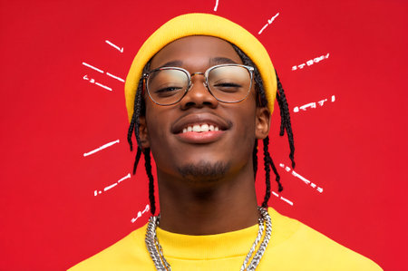 Close-up portrait of a young Black man wearing a yellow beanie, glasses, and layered silver necklaces against a red background. White scribbles are subtly present behind him.