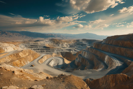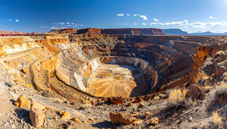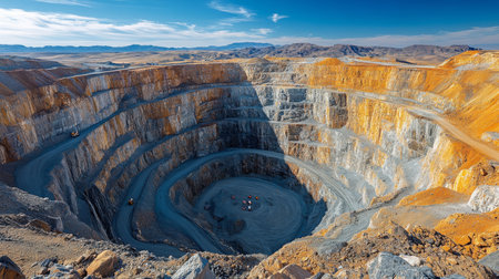 Vast Open Pit Mining Operation Reveals Layers of Minerals at a Remote Quarry Site During Clear Daylight Generative AI
