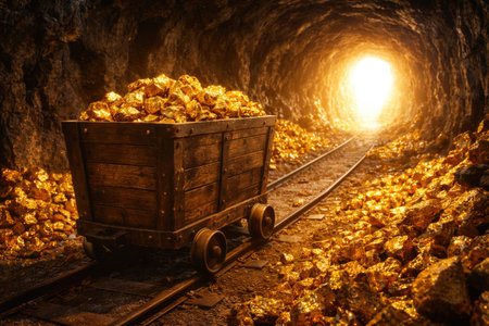 A rusty mine cart overflows with glaming gold nuggets deep within a dimly lit cavern