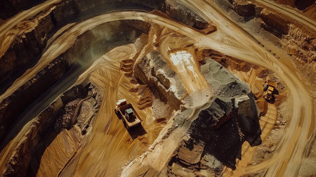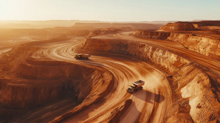 Captivating aerial view showcasing an open-pit mining operation at sunrise, featuring large dump trucks traversing dusty roads, highlighting industrial activity.
