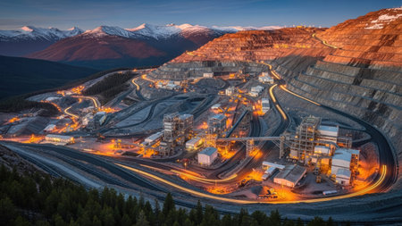 An overhead shot portrays a large-scale industrial mining complex nestled amidst mountainous terrain. The scene features multiple structures, roads, and exposed earth, illuminated by artificial lighting at twilight. The composition utilizes vibrant colors, emphasizing depth and scale, suggesting potential applications in industrial reporting or resource-related content.