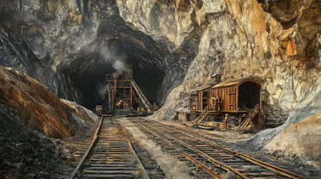 This image captures a vintage coal mining scene featuring train tracks and heavy machinery within a rocky tunnel, highlighting industrious miners at work.