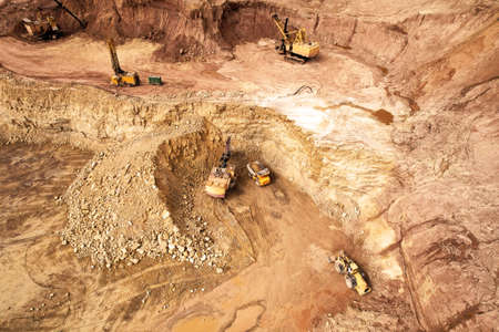 Yellow cars in a large quarry mining granite