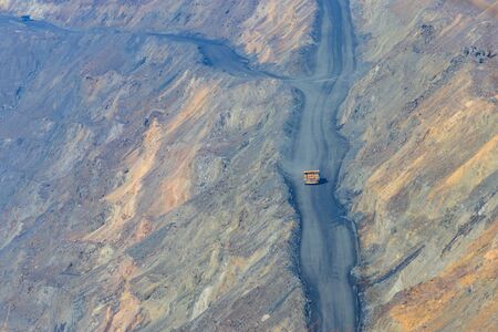 Yellow dump truck loading minerals copper, silver, gold, and other at mining quarry.