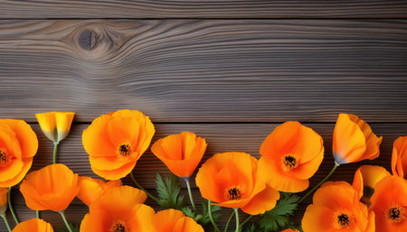 A field of many bright orange poppy flowers with a level horizon. Generative AI