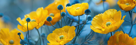 Yellow poppies on blue background. Close-up. Horizontal banner.