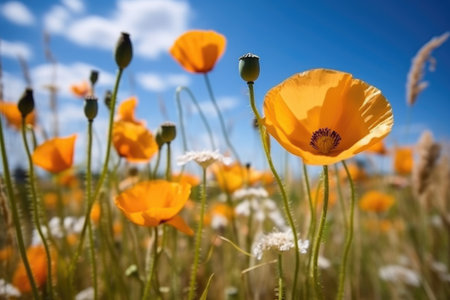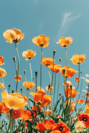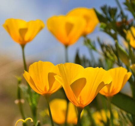 Low angle view of blooming California poppies, Eschscholzia Californica, against a blue sky.