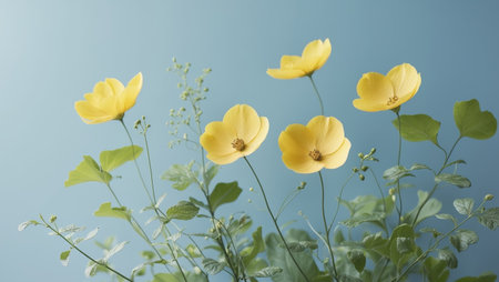 AI Generated. Yellow Flowers and Greenery Frame a Blue Background