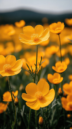 A field of bright yellow wildflowers blooms in a vast, grassy meadow. The flowers are in focus and the mountains in the background blur to a soft haze. The image radiates a sense of serenity and tranquility.