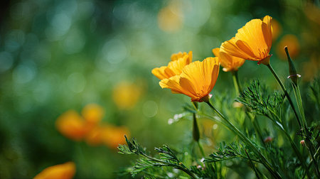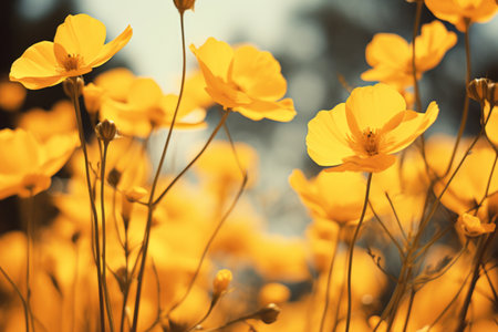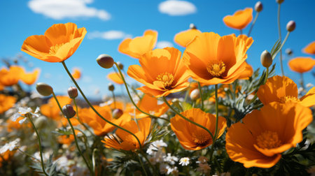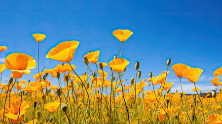 Close-up of golden California poppies shining brightly under the sun, blooming under a clear sky