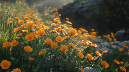 This stunning image showcases vibrant orange flowers blooming in a sunlit meadow. The lush greenery and soft sunlight create a peaceful and serene atmosphere.